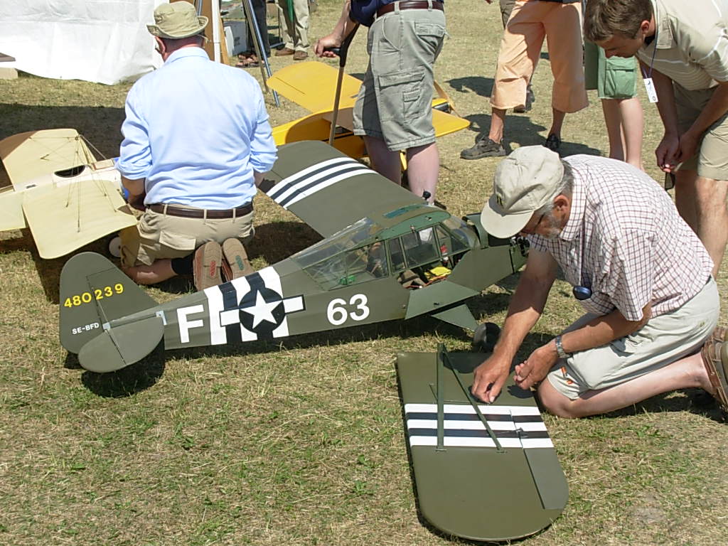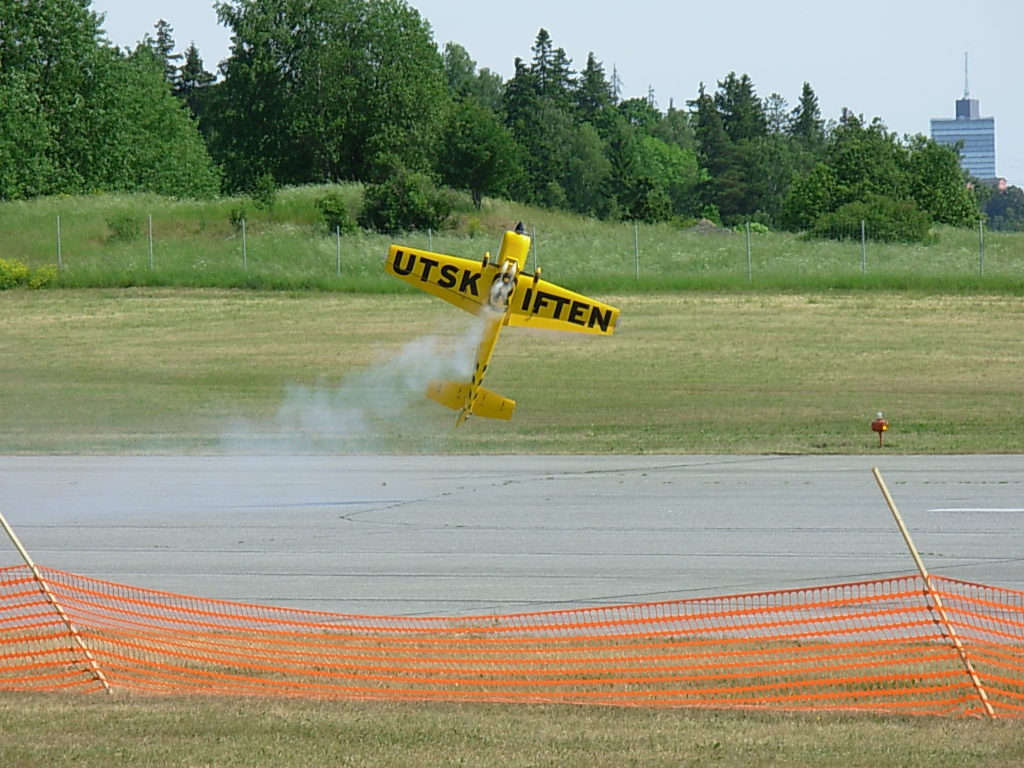 Tog pendeltåget till Barkarby station och sen buss som stannade strax utanför vandrarhemmet som låg inom synhåll från Barkarby flygfält. Toppen, tänkte jag... det blir bara en kort promenad i morgon. Mer om detta strax. Skrev in mig i gästboken strax under Per Strömmen från Norge. (Per flyger turbin-jet modeller och arbetar som pilot på SAS). Första kvällen gick åt till att bekanta mig lite med området och före läggdags kollade jag på uppskjutningen av Atlantis på NASA-TV på vandrarhemmets dator. Lördag morgon och dags att bege sig till fältet. Från vandrarhemmet såg jag ena änden av fältet men ingen aktivitet så det tydde på att allting hände i andra änden. Men inga skyltar nånstans och ett högt metallstaket med taggtråd omringade fältet. Några portar såg jag men de var alla låsta. Jag frågade några förbipasserande och fick lite olika vägbeskrivningar. Nåja, jag traskade vidare och efter nästan 2 timmars vandring i 32 graders värme hittade jag äntligen fram. Det visade sig sen att det finns en mycket kortare väg, c:a 20 min. Jag får tacka den äldre herren i hangaren för tipset och han lånade dessutom ut en liten ihopvikbar cykel till mig så jag kunde ta mig dit enklare nästa dag! Det var stor publik och en massa tält där olika hobbyfirmor sålde sina grejer. Det mesta inom modellhobbyn fanns att beskåda. Mest flygplan förstås, men även helikoptrar, bilar, båtar och så modellerna som skulle tävla i SpeX-flight klassen. Dessa är svåra att kategorisera eftersom det handlar om flygande gräsklippare, parkbänkar och hajar. |